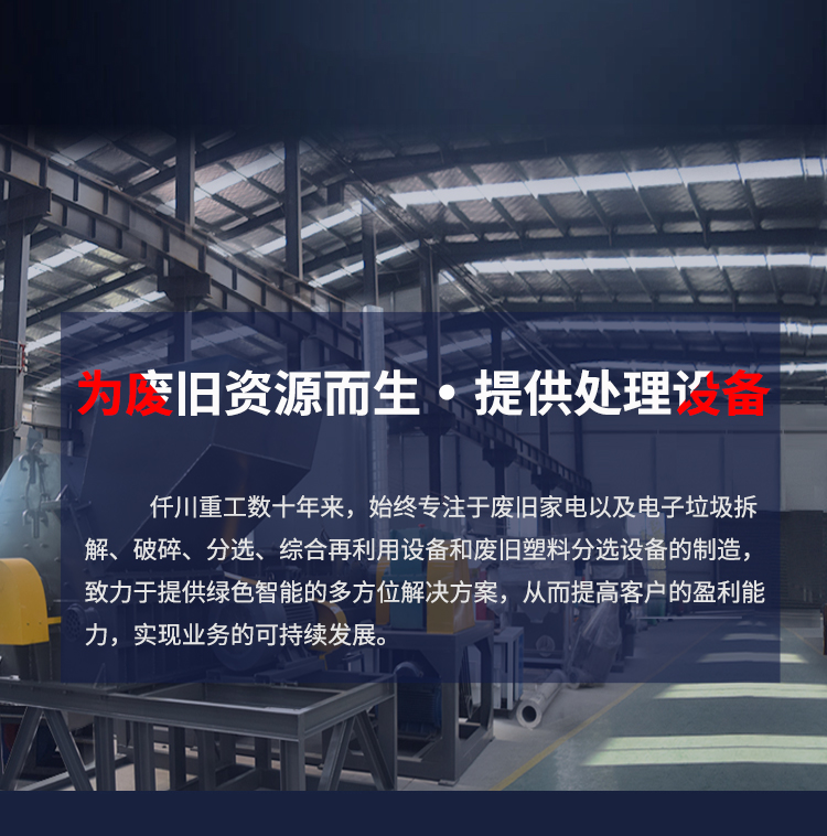 仟川重工數(shù)十年來,始終專注于廢舊家電以及電子垃圾拆解、破碎、分選、綜合再利用設備和廢舊塑料分選設備的制造,致力于提供綠色智能的多方位解決方案,從而提高客戶的盈利能力,實現(xiàn)業(yè)務的可持續(xù)發(fā)展。